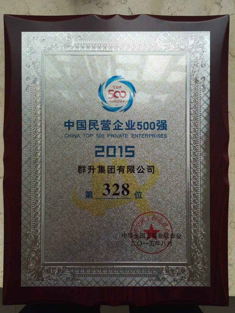 2015年10月20日上午,中国工商联合会委托金华市工商联给群升集团送来一份惊喜——“2015中国民营企业500强”奖牌。