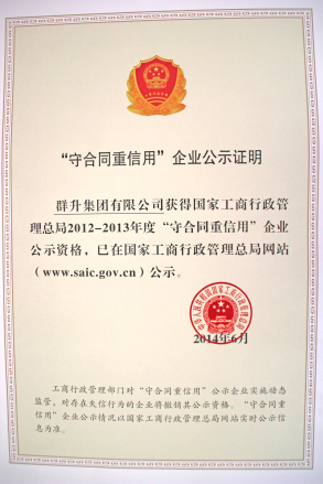 据悉,国家对申报“守合同重信用”企业要求极为严格,标准极高。申报国家工商总局公示的企业必须是连续三年以上的省级“守合同重信用”企业,必须符合“企业和品牌具有社会影响力、合同信用管理体系健全、合同行为规范、合同履约状况好、经营效益达到较高水平、社会信誉好”等6大基本条件的企业才有申报资格。群升集团凭借多年的诚信经营和管理,最终通过县、市、省三级层层筛选,最终经由国家工商行政管理总局公平、公正、公开的评选中获此殊荣。荣誉的获得也是国家和社会对群升合同管理水平、诚信履约形象、品牌影响力及社会公信力的高度认可,是企业的一项无形资产;群升表示公司将以此为契机,进一步提升合同管理水平。