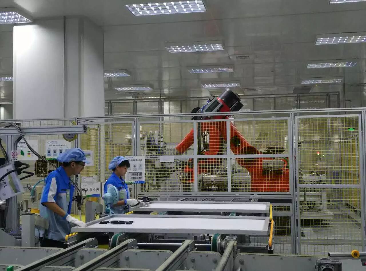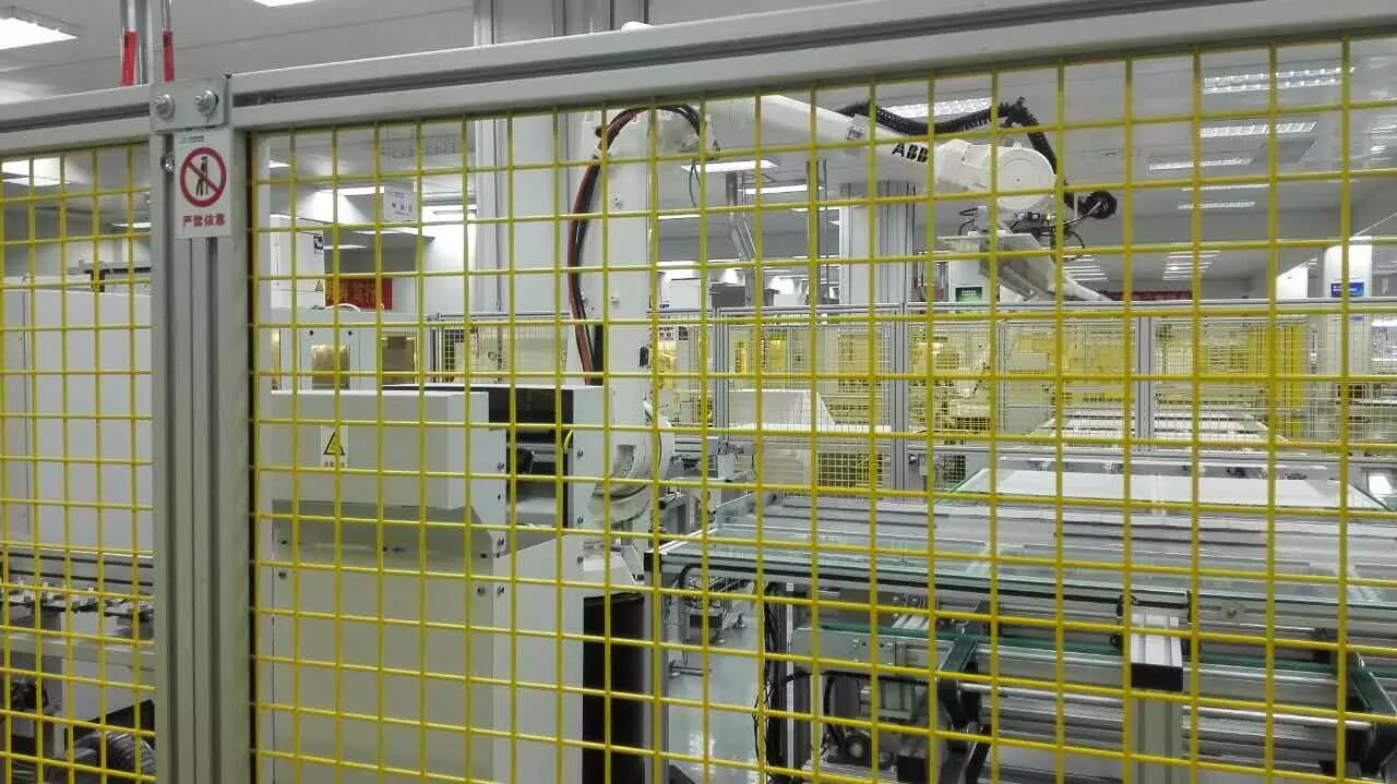 在组件车间里,正在工作的工业机器人吸引了小新的目光,它们代替了工人们的工作,减轻了工人们的劳动强度,提高了单位劳动效能。只见两个黄色机器人精准地焊接太阳能电池片,红外加热的焊接操作方式稳定、洁净、安全,它们把焊点、温度控制得很好。两个橘色机器人将成组电池稳稳搬起,安放在固定位置上,产品排列得非常整齐,没有一丝错位……截至目前,公司的各类机器人和机械手已超50台。